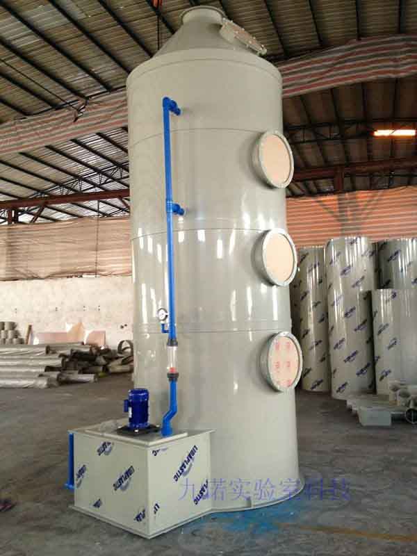 风机带动化学酸雾通过水喷淋装置,遇到喷洒成细雾的中和液体,废气被吸收到细小液滴的表面而排到收集槽内,洁净的空气进一步过滤除雾后排放到大气中,液体通过泵从收集槽抽到上部的喷嘴喷出,与废气发生中和反应后排放到收集槽内,废液处理后排放到外界或循环使用。